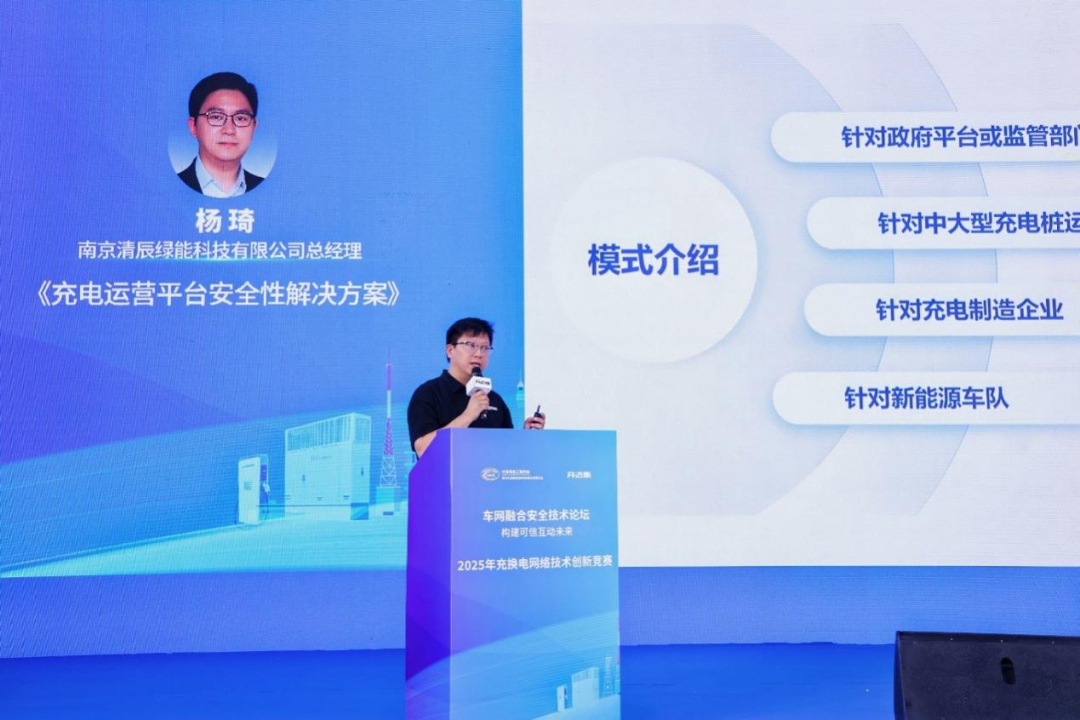 南京清辰绿能科技有限公司杨琦介绍了《充电运营平台安全性解决方案》,展示了涵盖终端设备加固、数据传输加密、异常行为监测的多层防护方案。