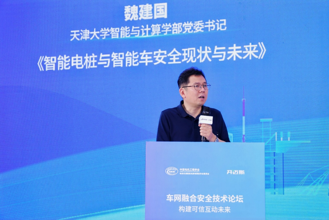 天津大学智能与计算学部党委书记魏建国教授在《智能电桩与智能车安全现状与未来》的报告中,分析了智能电桩与智能车面临的网络安全挑战,并提出了未来技术突破方向。
