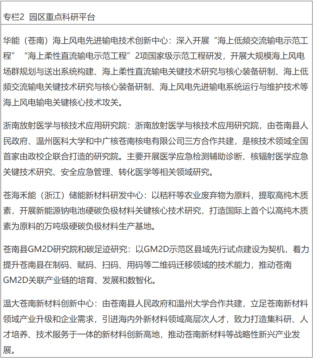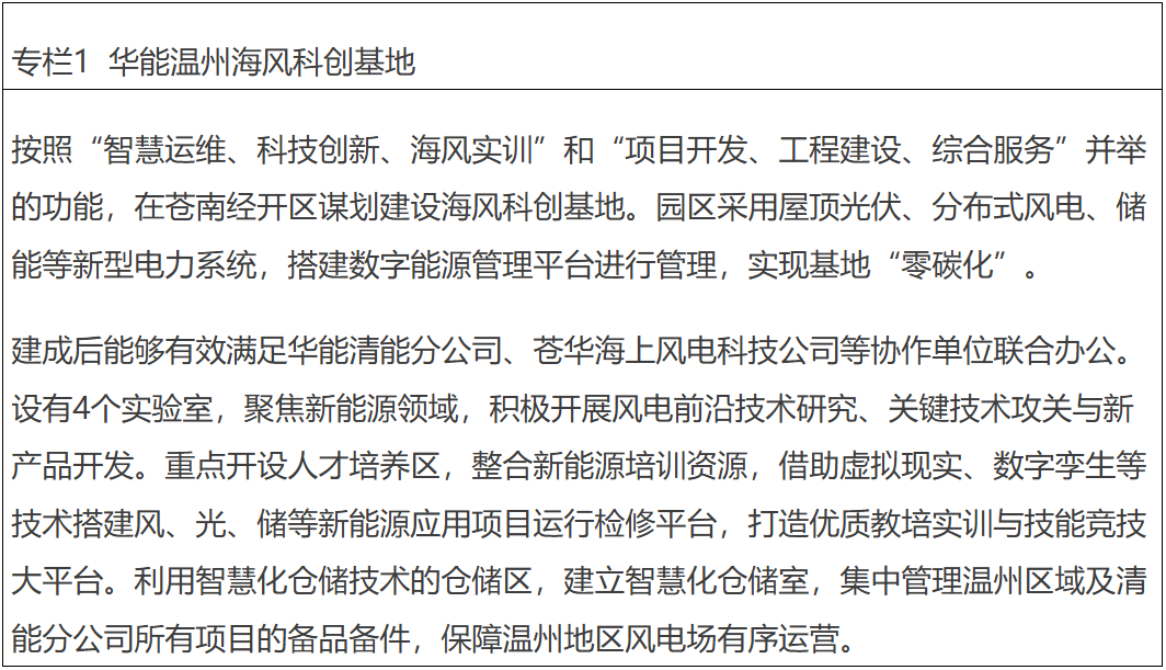构建风电全产业链生态。加快绿能小镇、远景苍南零碳产业基地的建设步伐,形成涵盖风机叶片制造、塔筒制造、智能化电气设备研发制造、风机整机和配套设备制造、大型设备物流、研发创新等在内的风电全产业链,建成具有国内国际影响力的海上风电装备制造基地。谋划具备海上风电基础模块制造、风机及基础总装、施工建设、运维服务、研发试验等功能的风电枢纽,推动海上风电产业向高效率、高技术和高价值方向发展,促进海上风电可持续发展。加强海上风电等配套服务设施建设,推进华能温州海风科创基地建设,形成集海上风电科技创新、海风培训等功能为一体的综合性多功能服务基地,有效保障海上风电资源利用。